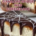 A festive Spooky Chocolate Ganache Spider Web Cheesecake featuring a crunchy digestive biscuit base, smooth cream cheese filling, rich dark chocolate ganache, and a striking white chocolate spider web decoration. Perfect for Halloween celebrations or any chocolate lover’s treat.